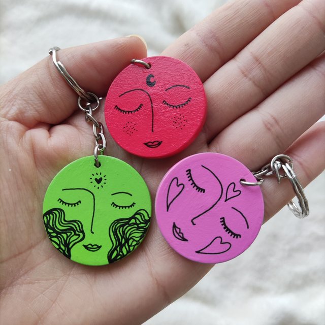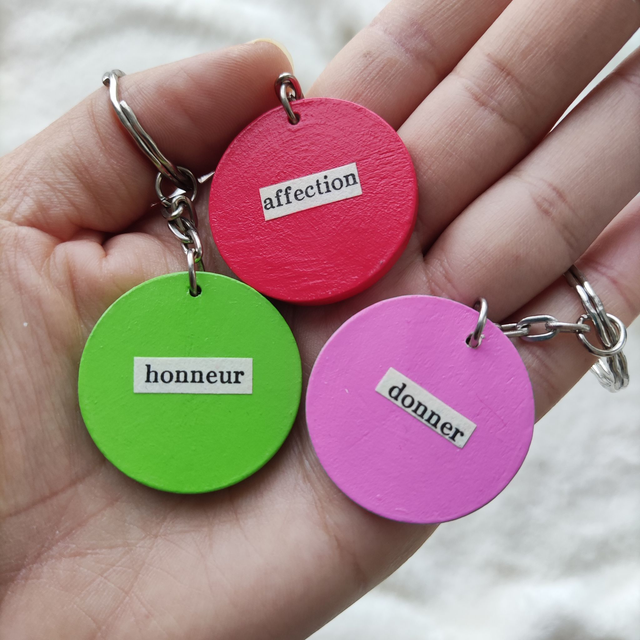 Porte-clés unique en bois d'environ 3,5cm de diamètre, finition vernis brillant.
