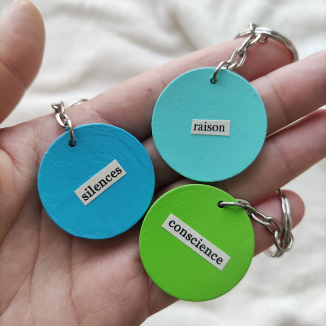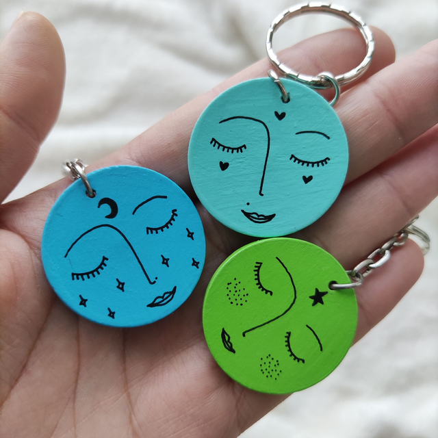 Porte-clés unique en bois d'environ 3,5cm de diamètre, finition vernis brillant.